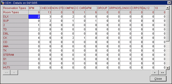 Zoom In. This function displays a breakdown of reservations by room type and by reservation type for a single day in a matrix format. This display would be useful, for example, if your property has a tower section and a regular section; you could see how many tower room guests (room type) are guaranteed (reservation type) and how many are tentative. With this information, you can judge how many rooms in each room type to overbook.