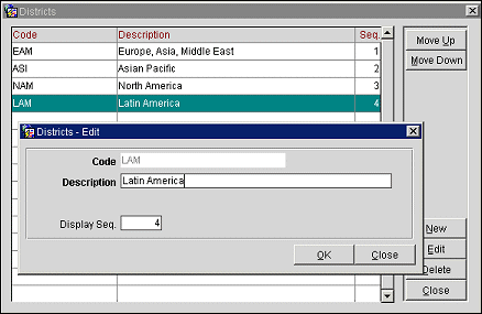 Seq. Sequence number that controls the position of the district in listings. To reposition an entry in the list, highlight the record and select the Move Up or Move Down button.
