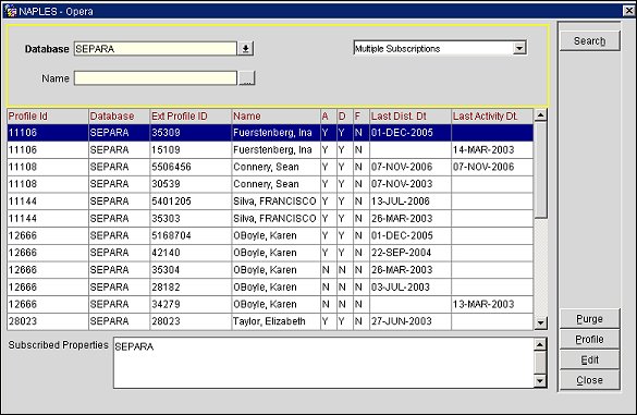 Select Multiple Subscriptions from the LOV to display a profile in ORS having multiple subscriptions in PMS. The multiple profiles with the same ORS Profile ID are mapped to different External Profile IDs. This means there is one profile in ORS mapped to multiple profiles at the PMS. Users can quickly identify in the grid which are active or inactive.