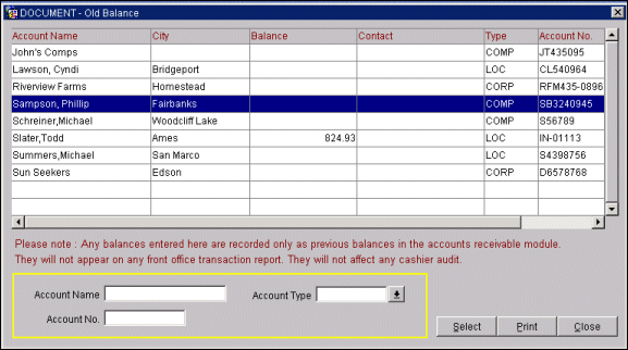 To enter old balances from external accounting systems into OPERA Accounts Receivable, select System Configuration>AR>Enter Old Balances. The Old Balance search screen appears.