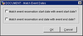 Match Dates. Available for Events that are booked in rooms that are designated 'Can Be a Meeting Room' on the Room Types New/Edit screen. Use this option to Match an Event date to the Event Reservation date. When this option is selected, the Match Event Dates screen displays which prompts you to choose between matching the Event Reservation start date to the Event start date or the Event Reservation end date to the Event end date. Select the appropriate check-box then click the OK button to proceed.