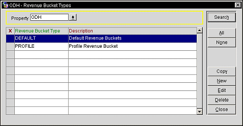 Copy. Select the type(s) you wish to copy to another property and select this button. A list of properties appears. From the list choose the properties to copy the selected revenue bucket types to.