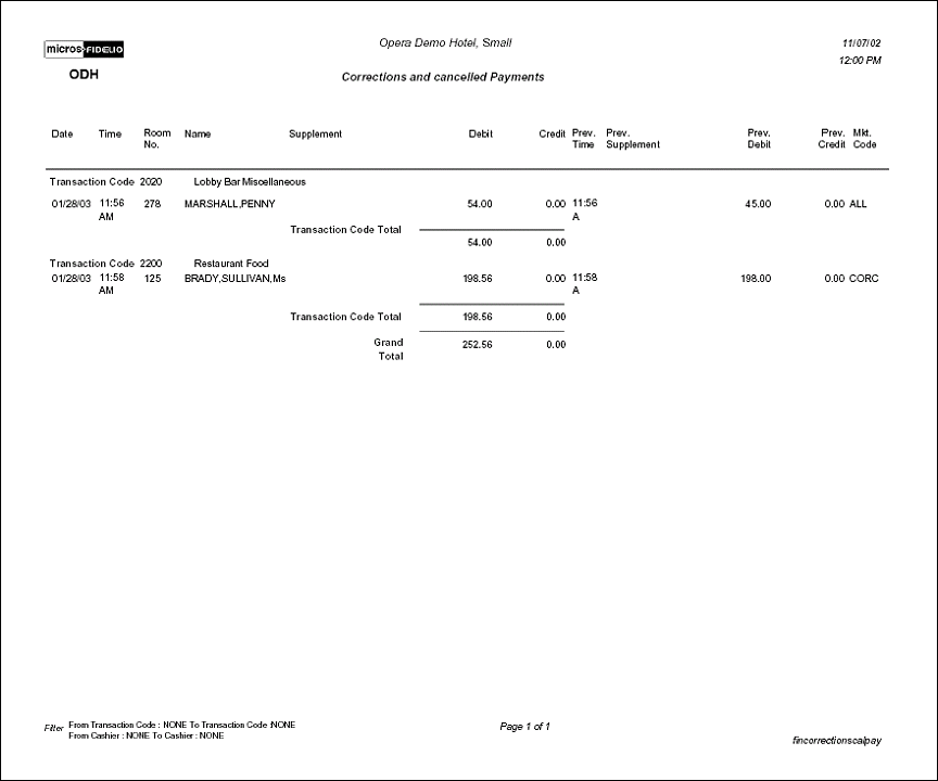 The Corrections and Canceled Payments Report displays all corrections by Cashier ID and can be run by transaction code range. This Journal displays all same-day reversals (debits) made to posting slips. Adjustments are made to previous days postings, or claimed revenue. Cashiering and Accounting departments can print this journal after making reversals to double-check their work.