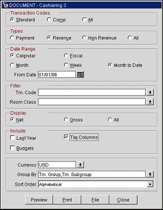 All. Display all transaction codes that have been posted for the date specified. You have the additional option of displaying the transaction code amounts for Revenues as Net or Gross.