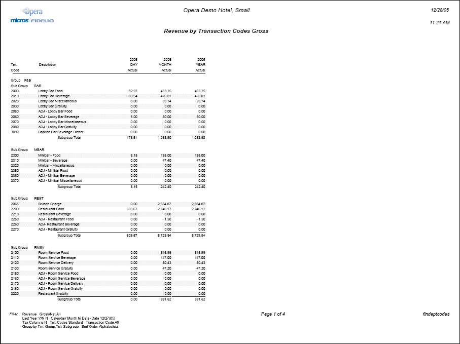 Standard. The report output will only include the regular Transaction Codes that have configured for your property. Transaction Codes are configured in Configuration>Cashiering>Codes>Transaction Codes.