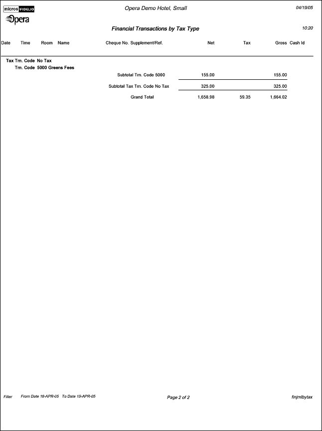 If you post an advanced bill for future days and the transaction is configured with exclusive tax the tax postings for all days will be posted with the current business date. However, the 'master/revenue' transactions will be posted for the days they will be consumed. This means the report output can have values in the ‘Tax’ Column, while the 'Net' and 'Gross' columns will be empty. The same would be true when the Transaction is displayed on the correct day, the Tax column will be empty since it was previously accounted for on the day the Advance Bill was run.