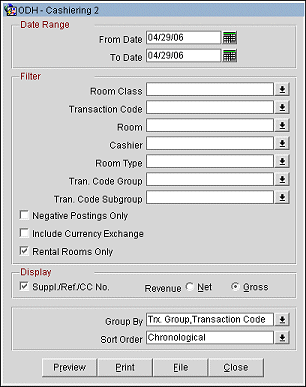 Sort Order. Cashier, Check No., Chronological, Room, Room Class, Transaction Code.