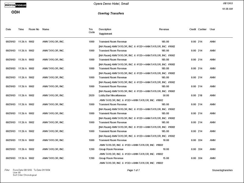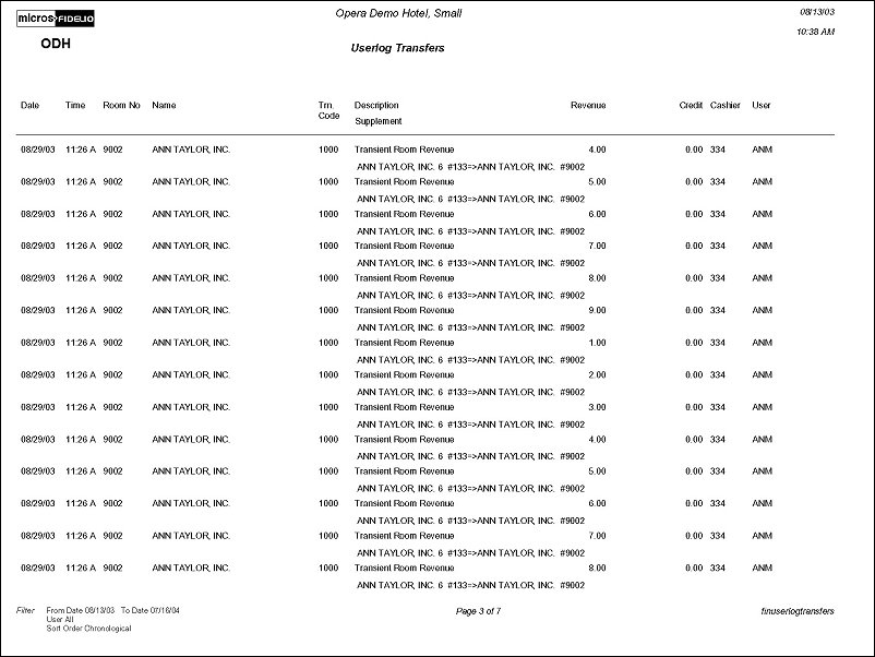 Sort Order. Available sort order options are: Chronological (default), Cashier, User, Transaction Code, Room No.