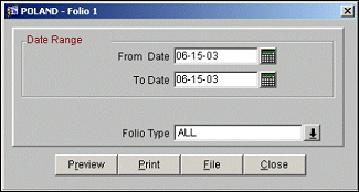 Folio Type. The option only displays if at least one of the Cashiering>Fiscal Folio Printing application parameter or Cashiering>Credit Bill application parameters is set to Y.