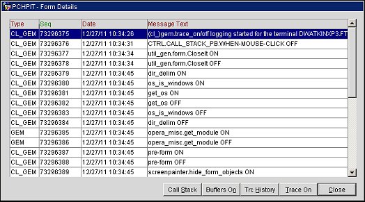 Hidden by default, the CL_GEM and GEM Trace detail screen can be displayed by pressing the CTRL and SHIFT keys and clicking on the Call Stack button on the Help form.
