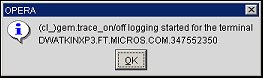 Trace On/Trace Off. Trace files provide details on the OPERA activity while performing a task. To create a trace file, select the Trace On button. When prompted, confirm the name of the trace file that will be created to hold the trace data. Close the Form Details screen and perform an action in OPERA as directed by Support. Then return to the Form Details screen and select the Trace Off button. Use the Trc History button option to download and review the trace file that was created.