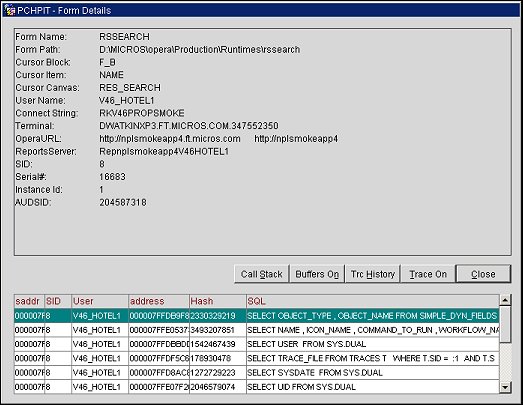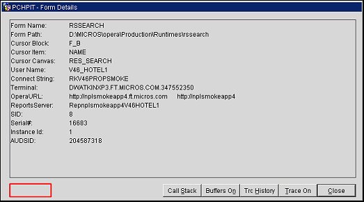 The Form Details screen provides diagnostic information that may be useful to the Oracle Support Team when called upon to investigate a problem you have reported. If requested by Support you may access this screen by selecting Ctrl+Shift+Page Down from any OPERA screen.