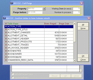 Prior to starting the purge, the routine automatically ensures that sufficient rollback and table space exists for building purge tables, holding the purge details, and for storing historical copies of purged folios in PDF form (dont worry the amount of space necessary to hold this information is minimal). In addition, the routine ensures that all ledgers are in balance. As the Full Purge runs, OPERA dynamically indicates the number of reservations pending purge as well as the percentage completed.