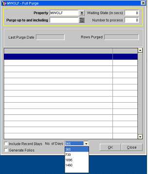 The purpose of the OPERA Full Purge utility is to provide a means for removing selected financial and data from the OPERA database when it is no longer needed. The Full Purge routine irrespective of the dates selected will not delete any reservations or associated records that have a departure date less than 2 years from the current business date.