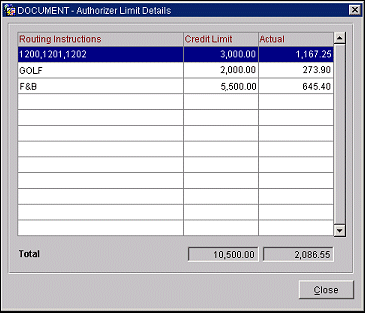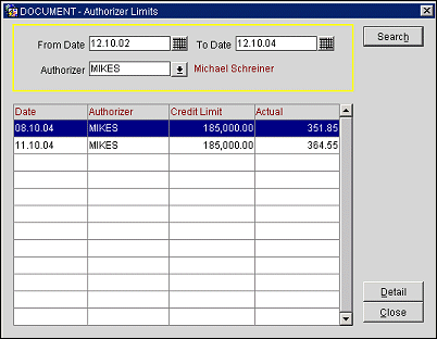 By highlighting an authorizer and selecting the Detail button, you can see the specific routing instructions that the authorizer has set up for that day, the approval limit set for the authorizer for that transaction routing instruction, and the actual amount the authorizer has approved for that transaction routing instruction.