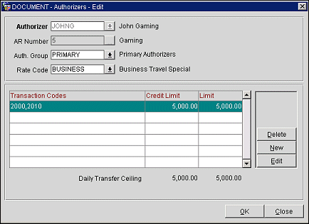 When you set up an OPERA user as an authorizer, you specify the transaction code(s) and routing codes that the authorizer may comp, and the per-day ceiling value (or "credit limit") for transaction codes and/or routing codes, and the per-instance ceiling value for comped transactions. You may also select or set up an AR account that will be used to automatically receive comp transaction for AR handling. The complete process for configuring OPERA users as authorizers is discussed in the following sections.