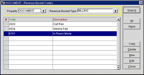 Copy. Select the code(s) you wish to copy to another property and select this button. A list of properties appears. From the list choose the properties to copy the selected comp revenue buckets to.