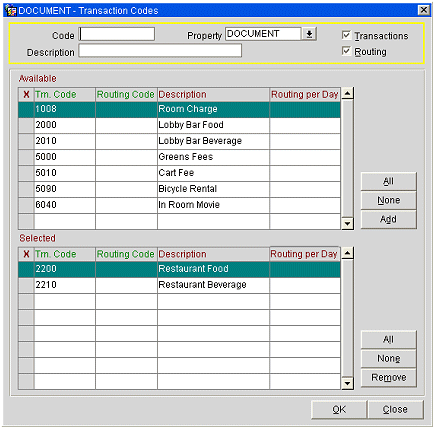 As an example, routing code FBA and FBB could be defined to group food and beverage charges at two specific restaurants. Routing code RMZ could be defined to group all room charges, including bed tax and state tax.