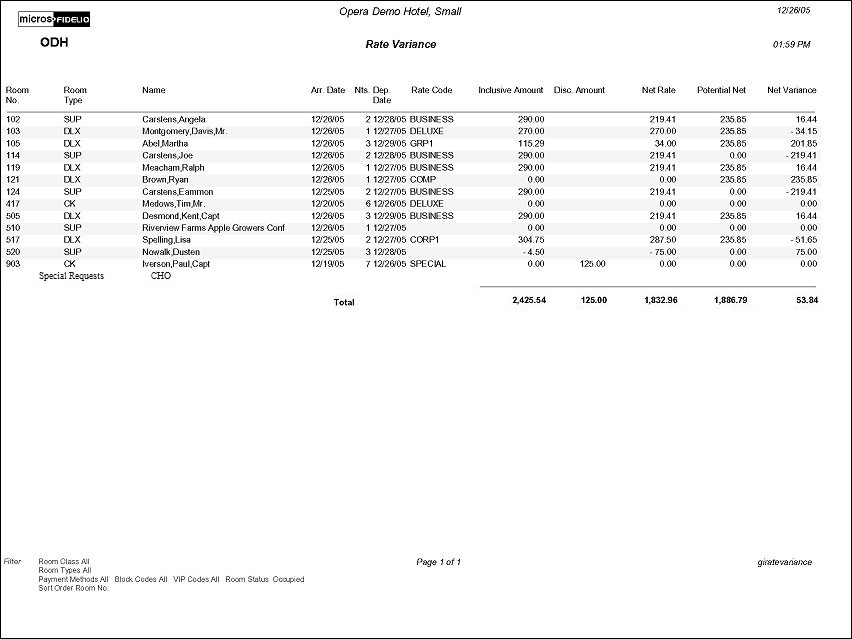 The Guests In House Rate Variance Report displays consolidated rate check statistics for guests in house. Depending on the Selection Criteria chosen, a report can be generated for today's checked in arrivals, occupied rooms only, or for all rooms configured in the property. The report output will display an alternating gray background for every other reservation in order to make the details of each reservation stand out.