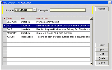 To configure global alerts, select Configuration > Reservations > Codes > Alert Definition > Global Alerts. The Global Alerts screen displays.
