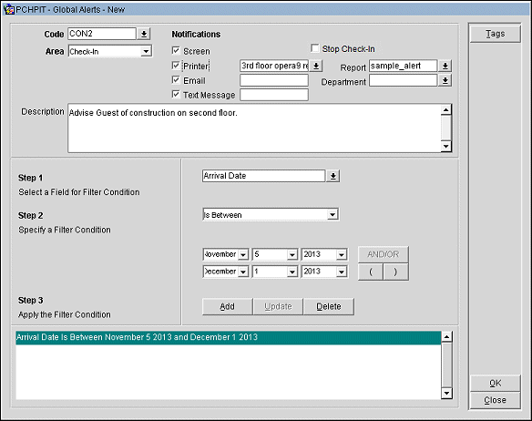Note: When you select the OK button, OPERA verifies that the alert is correctly configured. OPERA will not allow you to save the global alert if a problem is detected. If problems exist in global alert messages configured prior to this verification being implemented, an error message appears when the applicable screen is opened (e.g., the Reservation screen, the Billing screen, etc.) and OPERA attempts to display the global alert. The error message identifies the global alert that is causing the problem so that the configuration for that alert can be corrected.
