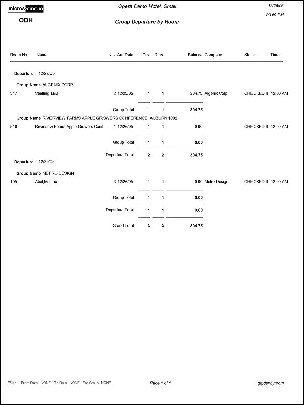 The Groups Departure By Room Number Report displays all the reservations in house, that have a group profile attached. The output is sorted by room number and are grouped by departure date. Print this report to see a list of all departing groups for a specified date.