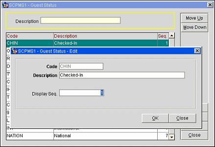 Select Configuration>Reservations>Codes>Custom>Guest Status to create a code to specify the status of guest, such as Checked In or Checked Out. The values used for the Guest Status list of values are entered here. If the field is to display, it must be Screen Painted on the Reservation form view.