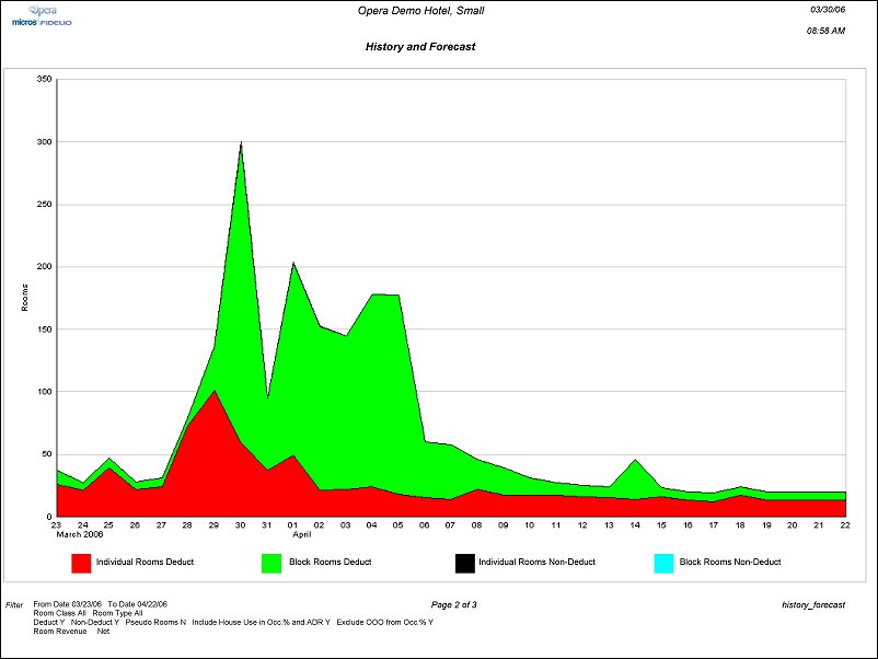The history_forecast report output will include both Block Rooms Picked Up (reservations have been made) and Block Rooms Not Picked up (rooms have been reserved in the Block Grid but reservations have not been made) in the GRP columns, but does not include block rooms when the block status is INQUIRY, REGRET and LOST. There is a breakdown between Deduct and Non Deduct.