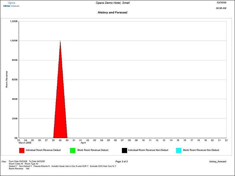 Note: When running the History and Forecast report [history_forecast.rep], the History and Forecast Business Block report [history_forecast_blk.rep], or the Business on the Books report [business_on_the_books.rep] for a date range where multiple-night block or individual reservations had an Advance Bill generated, the total LOS revenue is posted to History the first night after the night audit is run. The daily revenue is then subtracted from Forecast each subsequent night after the audit is run, until the LOS is depleted and/or the reservation block is checked out.