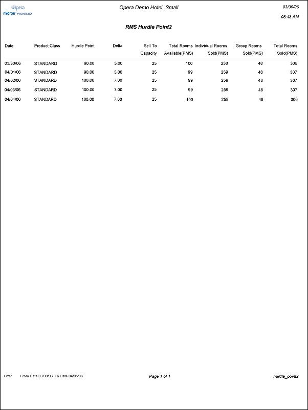 RMS Hurdle Point 2 displays all hurdle points (rates), including Total Rooms Sold and Delta details, for a property for a date range specified. The output is based on the activation of a Revenue Management license code. The report can be used by the hotel to check the Hurdle Point by Product Class/Yield Category for up to a year out and also indicates the Sell To Capacity values that have been set for the hotel in addition to providing you with inventory information.
