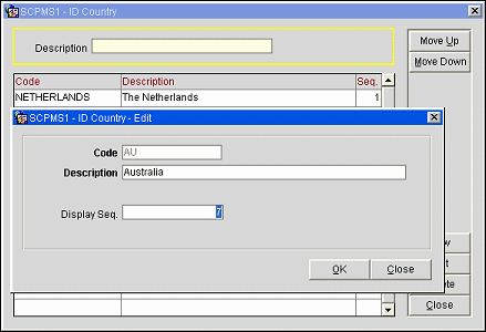 Display Seq. Enter a number that will determine the position of the ID country code when it is displayed in lists of ID countries. ID countries that do not have a sequence number assigned are displayed in alphabetical order following those codes that have a sequence number.