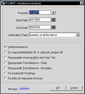 Verify Imbalance. Verifies if the item selected in the Verification Type field has an imbalance or not for a property, within a specified date range.