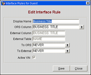 External Table. The external system column name that corresponds to the ORS column name. This is preset for our generic interfaces. For the UDF interface rules you have to know the table name and enter a correct value here, as no validation will take place at this time.