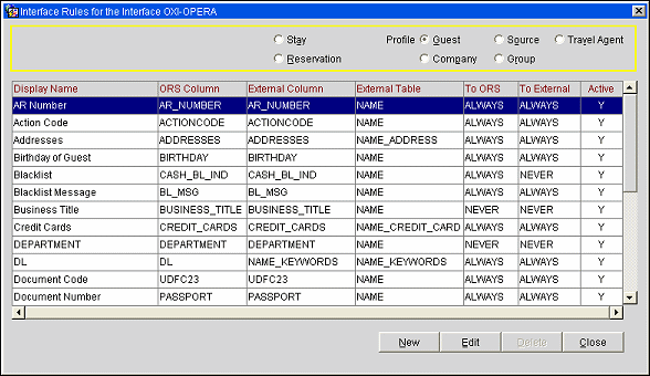 Interface rules determine whether a particular profile data item should be updated during data transmission to or from ORS. Interface Rules are applied on global level only and can be set differently between the profile types. For the standard interfaces OXI-OPERA, OXI-V6, OXI-V7, and OXI-CLS the configuration is preset during installation. You can add user defined fields (UDFs) from the ORS database to the already configured data items, as long as the external system field for the proper mapping is known.