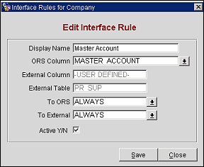 Example screen shot is showing Company profile selected with the Master Account entry highlighted. The example is showing that the information for Master Account with Company profiles will never be sent or accepted data. The rule is active. Passing of the Master Account data can be changed by Editing the rule and modifying the columns (To ORS and To External).