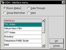 The Interface Menu allows users to manage the status of available features of the third- party systems that interface and interact with OPERA. The list of interfaces may include PBXs and other telephone systems, key cards and card lock systems, guest messaging systems, video entertainment and movie systems, minibars systems, and so on. To access the Interface Menu, select Miscellaneous>Interfaces>Interfaces (or select the Shift+F8 Quick Keys option).