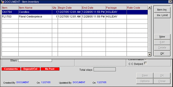 Note: You may not use the Item Inventory screen to edit or delete an item that is attached to the reservation as part of a package. The Edit and Delete buttons are unavailable when you highlight an item that is attached to a package. To delete the package or to change the package begin and end dates or package quantity, select the down arrow on the Reservation screen Packages field to open the Packages screen. See Package Selection for details.