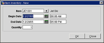 Begin Date/End Date. Range of dates and times for which the item is attached to the reservation. The default Begin Date is the reservation arrival date. The default End Date is the departure date. The default begin and end times are set in Item Inventory setup. If the item is included as part of a package, the dates shown here define the period when the package is attached to the reservation.