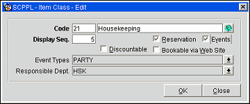 Events. Select this check box to indicate that this item class should be displayed when booking items in Sales & Catering. For example, you would probably not check this box if this item class included housekeeping-related items. (This check box is selected by default.)
