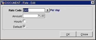 Hourly. Select this check box if you wish the system to compute the amount charged to the customer based on the length of time the item is booked. The amount shown in the Amount field will be multiplied by the number of full or partial hours the item is booked. If this check box is not selected, the amount shown in the Amount field is charged regardless of the time for which the item is booked. If your rate code is other than an hourly rate (e.g., a per-day or per-week rate) it would not be appropriate to select this check box.