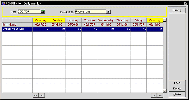 Use the Load feature to accommodate fluctuations in inventory due to factors such as the season, holidays, weekends, etc. The values you load here will override any default, or baseline, inventory quantity specified using the Item Inventory Setup screen (Configuration>Reservations> Item Inventory Setup).