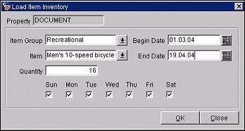 For example, assume you use the Resource Item Setup screen to specify 50 as the quantity in stock for rollaway beds. However, you know that during ski season (November 15 - April 15) your occupancy rate is higher and your quantity in stock is increased to 100 to accommodate the added guests. You could use the Load feature to change the inventory of rollaway beds from 50 to 100 for the period November 15 through April 15. Before and after that period, your inventory would show the default, or 50 rollaway beds.