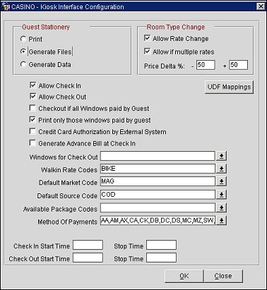 Walkin Rate Codes. This option enables kiosk-processing of walk ins. Up to 10 rate codes can be selected for presentation at the kiosk; only those rate codes having a default market code and source code on their rate header will be available for selection.
