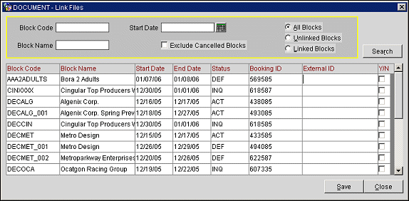 Select Configuration>External>Sales & Catering>Link Files, the grid displays the block code, block name, start and end date, status, external ID, and Yes/No checkbox.