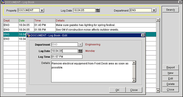 Note: The previous month's log book entries are purged from OPERA on the last day of each month. For example, if today is July 31st, the entries for June 1st through June 30th would be deleted.