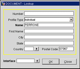If you are working from the guest's Profile screen Options menu, or if the guest record is selected on the Profile Search screen, information for the current guest will automatically appear on the Lookup screen. Provide the following information to perform a profile lookup. When you are done, select the OK button to submit the lookup to the external system.
