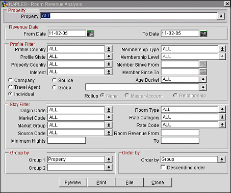 Profile Radio Button. Select one radio button for the profile type statistics for the room revenue: Company, Travel Agent, Group, Source, or Individual.