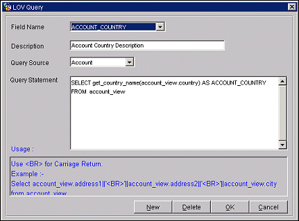 Query Statement. Enter the SQL select statement which pulls data for the field. A sample is shown in the Usage area.