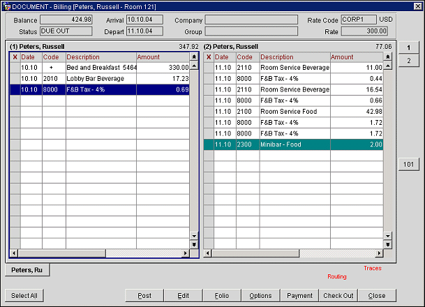 Using multiple windows allows you to separate posted transactions for your convenience or to meet the guest's billing needs. This way you can print separate receipts for a specific group of charges and, if you like, apply payments to each of the windows individually.