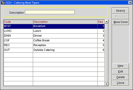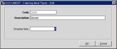 Description. Enter a description of the catering meal type. This description appears on LOV displays.